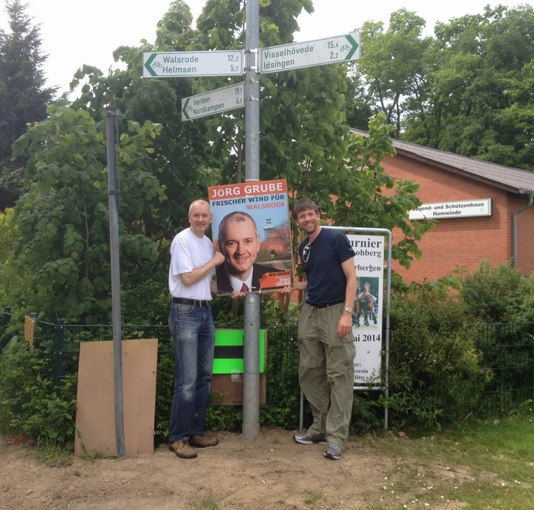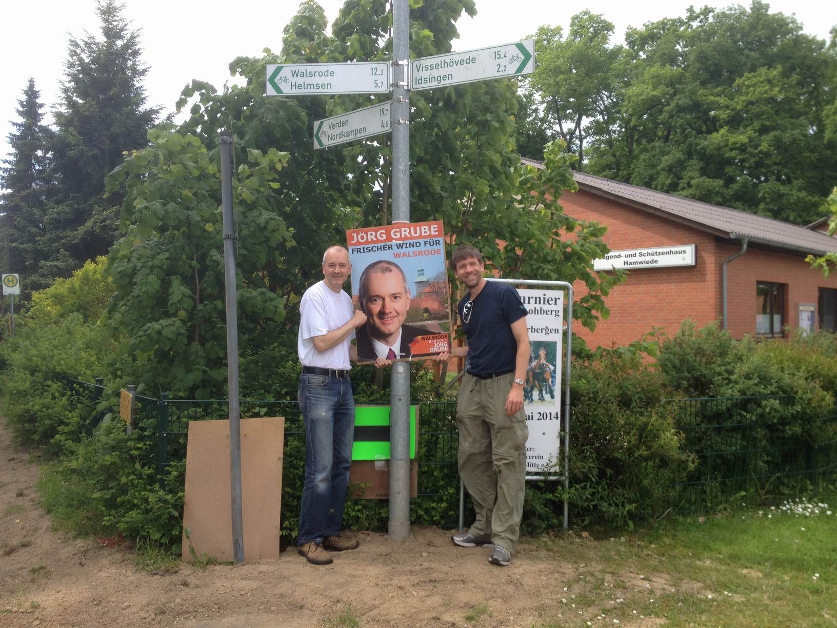 Foto: Jörg Grube mit Kent Lewandowski (Taufpate der ältesten Tochter) beim Aufhängen der Plakate 2014