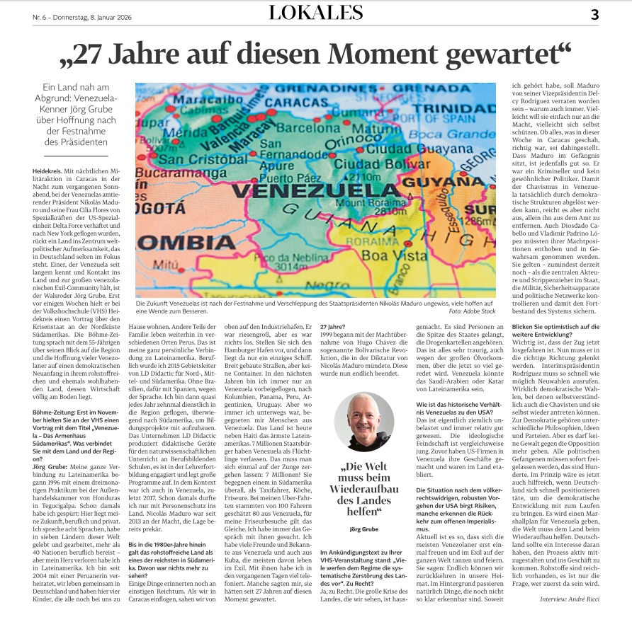 In einem Interview im Januar 2026 nahm ich Stellung zur politischen und wirtschaftlichen Situation in Venezuela. Internationale Entwicklungen haben oft auch Auswirkungen auf regionale Wirtschaft, Migration und gesellschaftliche Stabilität.